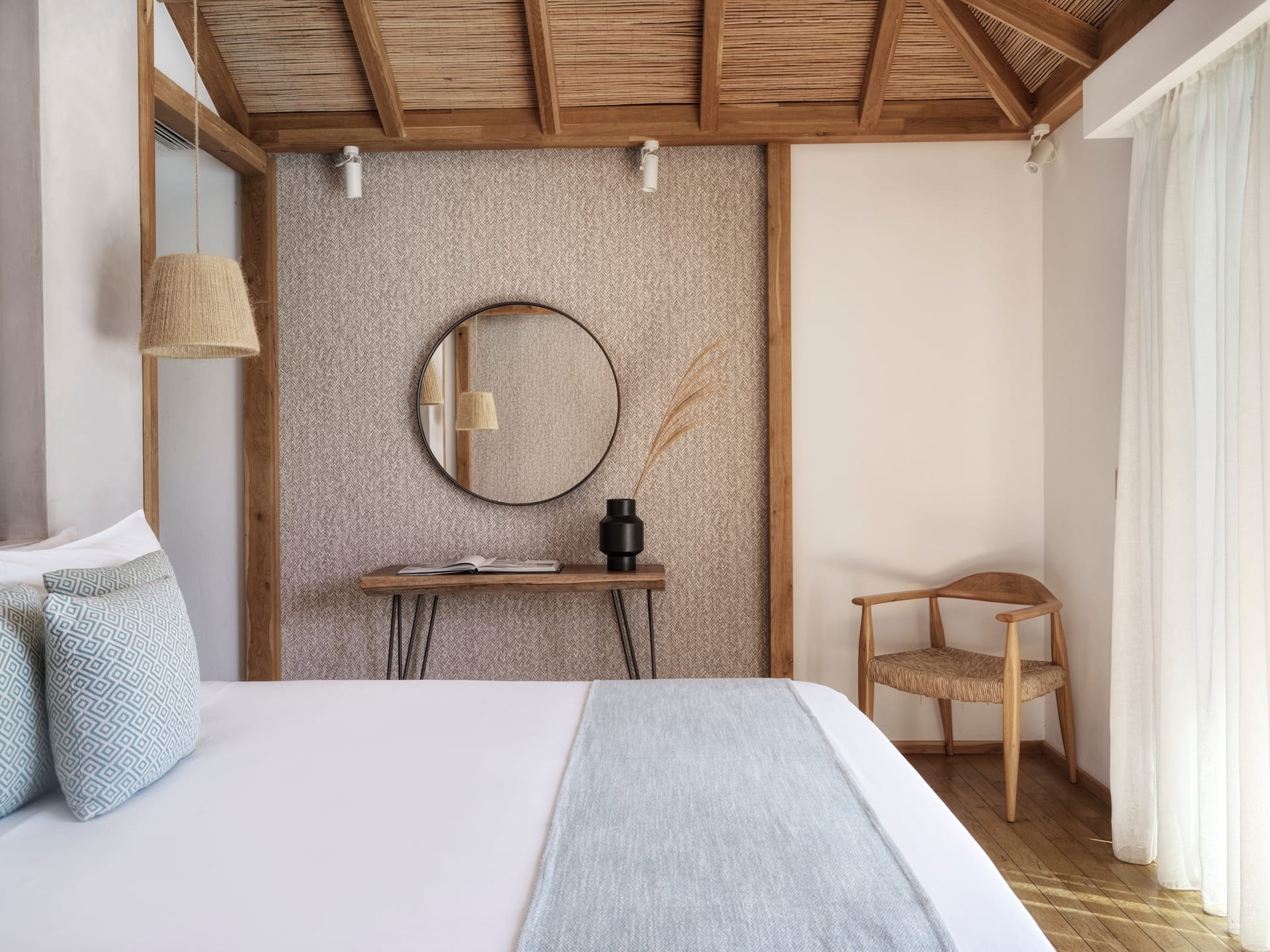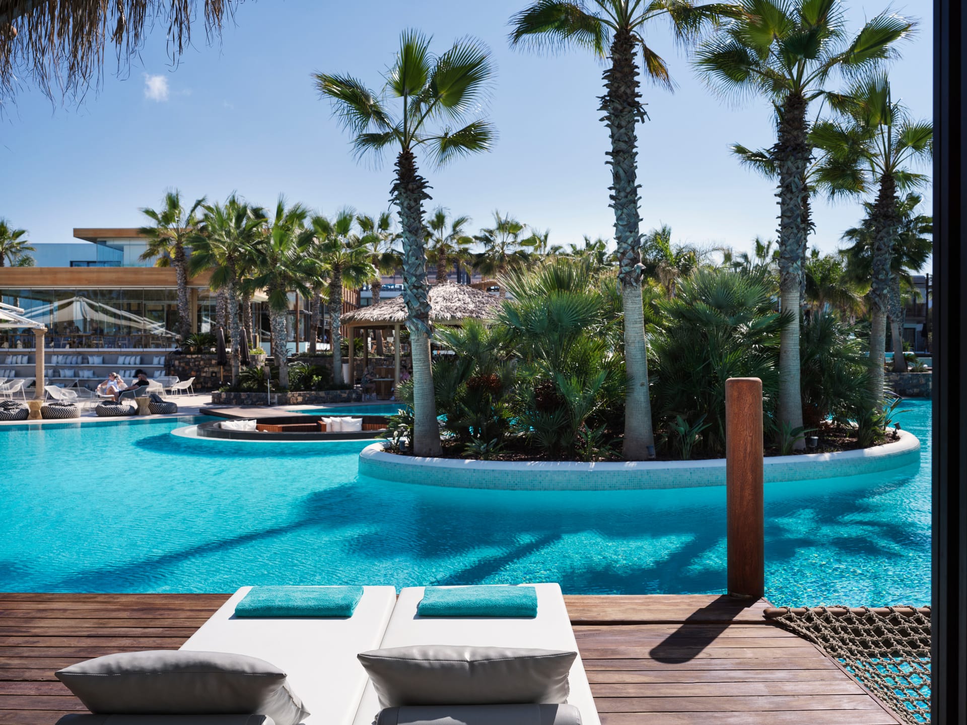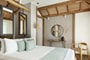 These Over Water Bungalows add an extra dimension to a holiday on Stella Island Luxury Resort: decorated with wood and glass, in tropical scenery, guests have direct access down from each sunbathing deck to the tranquil waters of a translucent lagoon-style pool. The bathroom consists of a walk-in shower with his & hers vanity and double sinks. A timbered veranda deck, with loungers and a unique hammock has been set into for relaxation.